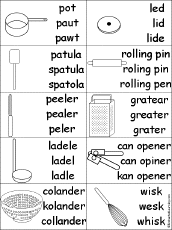 Circle the Correctly-Spelled Cooking Words Circle the correct spelling of cooking words, and then color the picture of the words. The words are pot, lid, spatula, rolling pin, peeler, grater, ladle, can opener, colander, whisk. |
