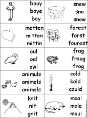 Circle the Correctly-Spelled Words from The Mitten Circle the correct spelling of words from The Mitten, and then color the picture of the words. The words are boy, snow, mitten, forest, owl, frog, animals, cold, knit, mole. |