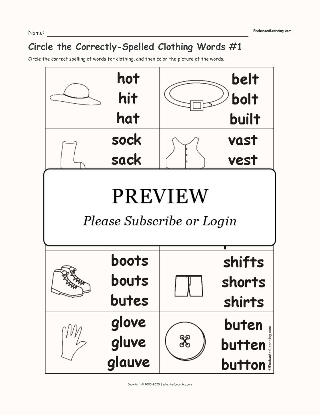 Circle the correct spelling of words for clothing, and then color the picture of the words.