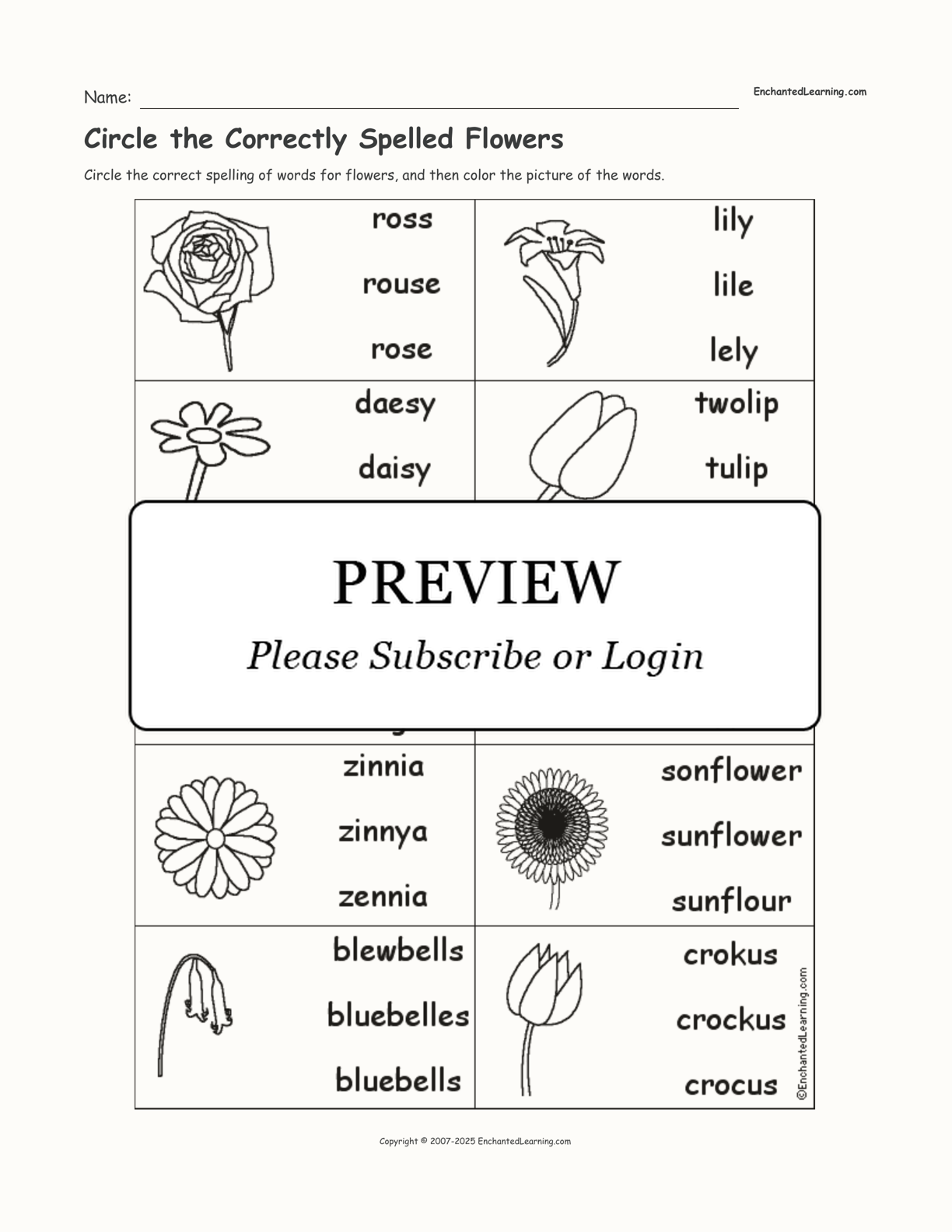 Circle the correct spelling of words for flowers, and then color the picture of the words.