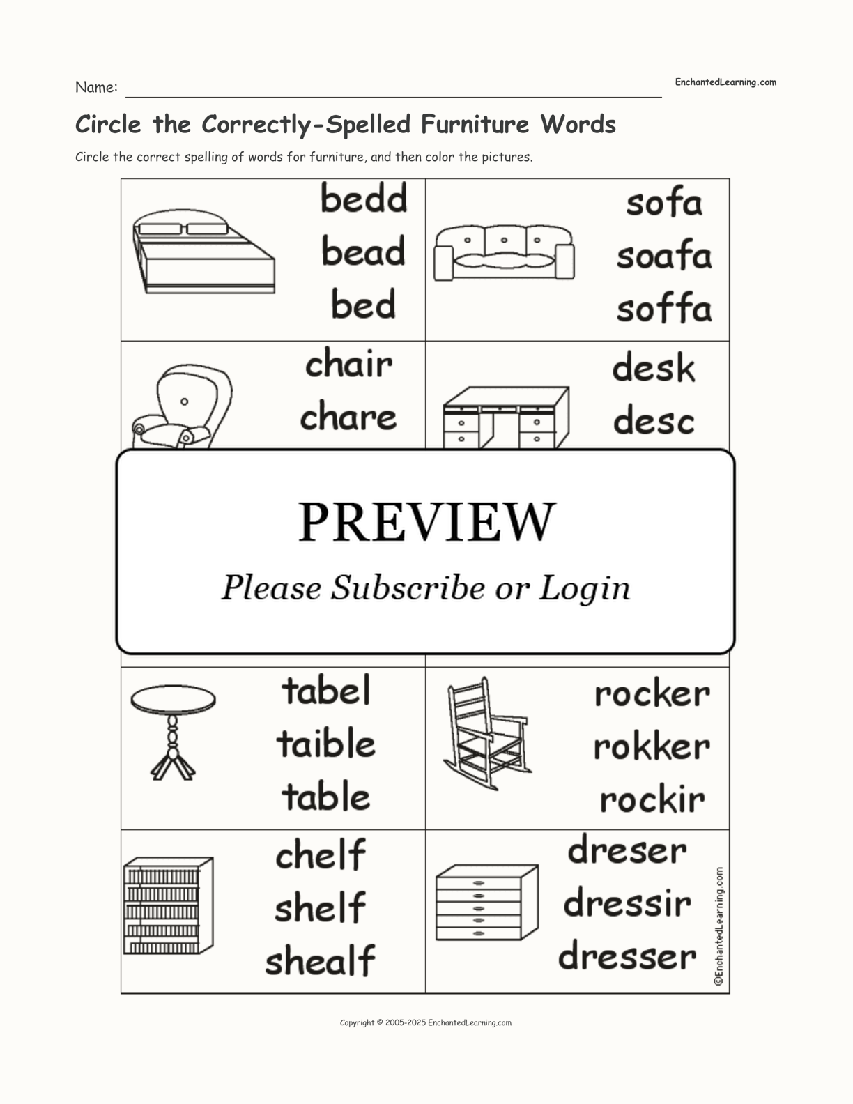 Circle the correct spelling of words for furniture, and then color the pictures.