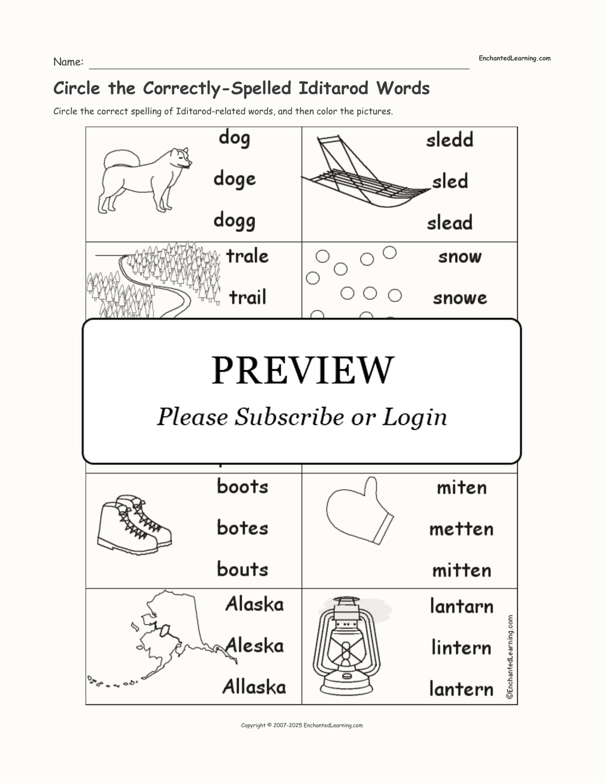 Circle the correct spelling of Iditarod-related words, and then color the pictures.