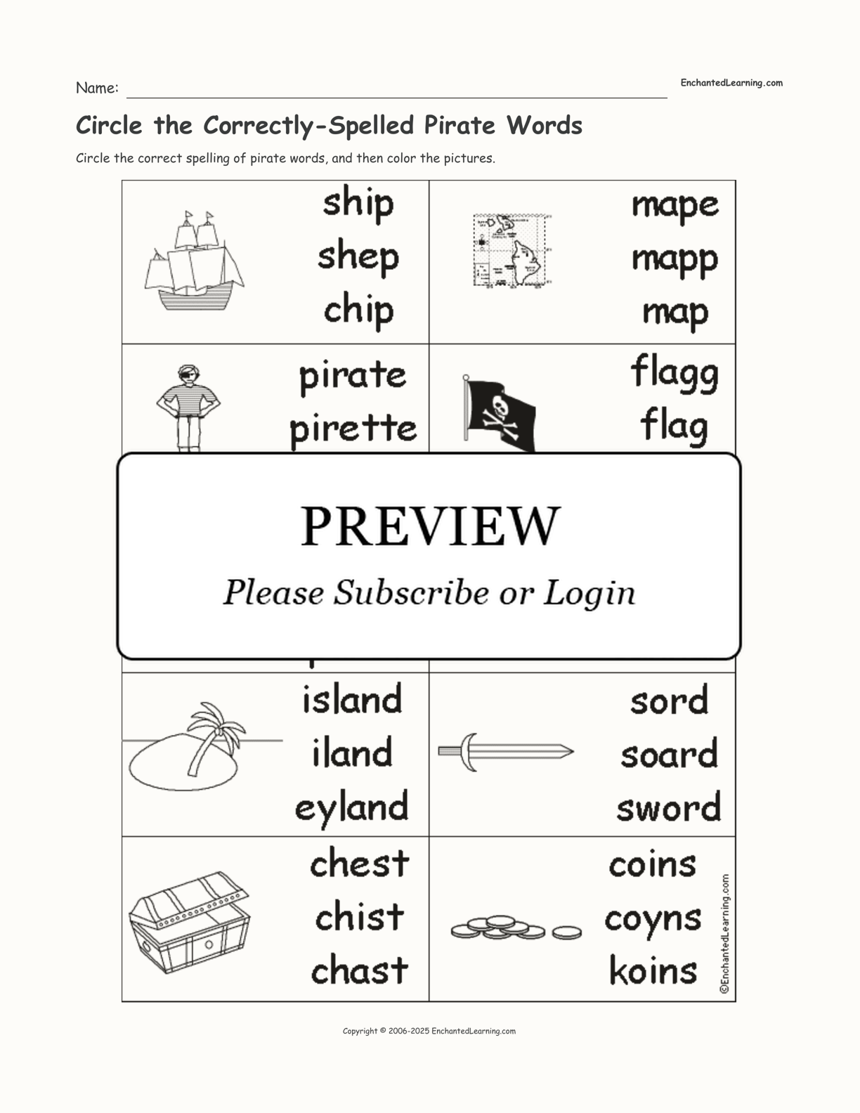 Circle the correct spelling of pirate words, and then color the pictures.