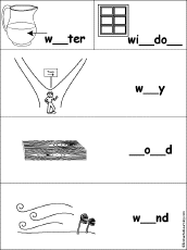 Missing Letters in Dolch Words #10 Find the missing letters in Dolch words, and then color the picture of the word. The words are water, window, way, wood, wind. |