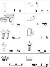 Missing Letters in Dolch Words #6 Find the missing letters in Dolch words, and then color the picture of the word. The words are leg, letter, house, kitty, men, milk, mother, man, money, morning. |