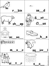 Missing Letters in Dolch Words #8 Find the missing letters in Dolch words, and then color the picture of the word. The words are robin, seed, sheep, Santa Claus, school, shoe, music, squirrel, sister, snow. |