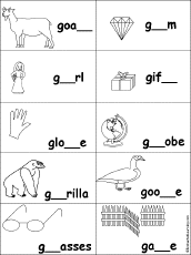 This is a thumbnail of the "Fill in Missing Letters in Words that Start with G" page. The full-size printout is available only to site members.