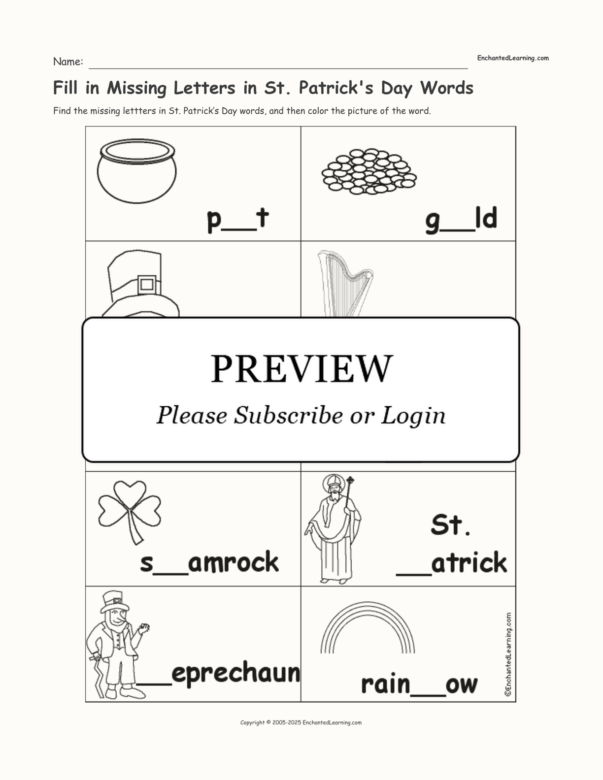Find the missing lettters in St. Patrick’s Day words, and then color the picture of the word. The words are: pot, gold, hat, harp, snake, Ireland, shamrock, St. Patrick, leprechaun, and rainbow.