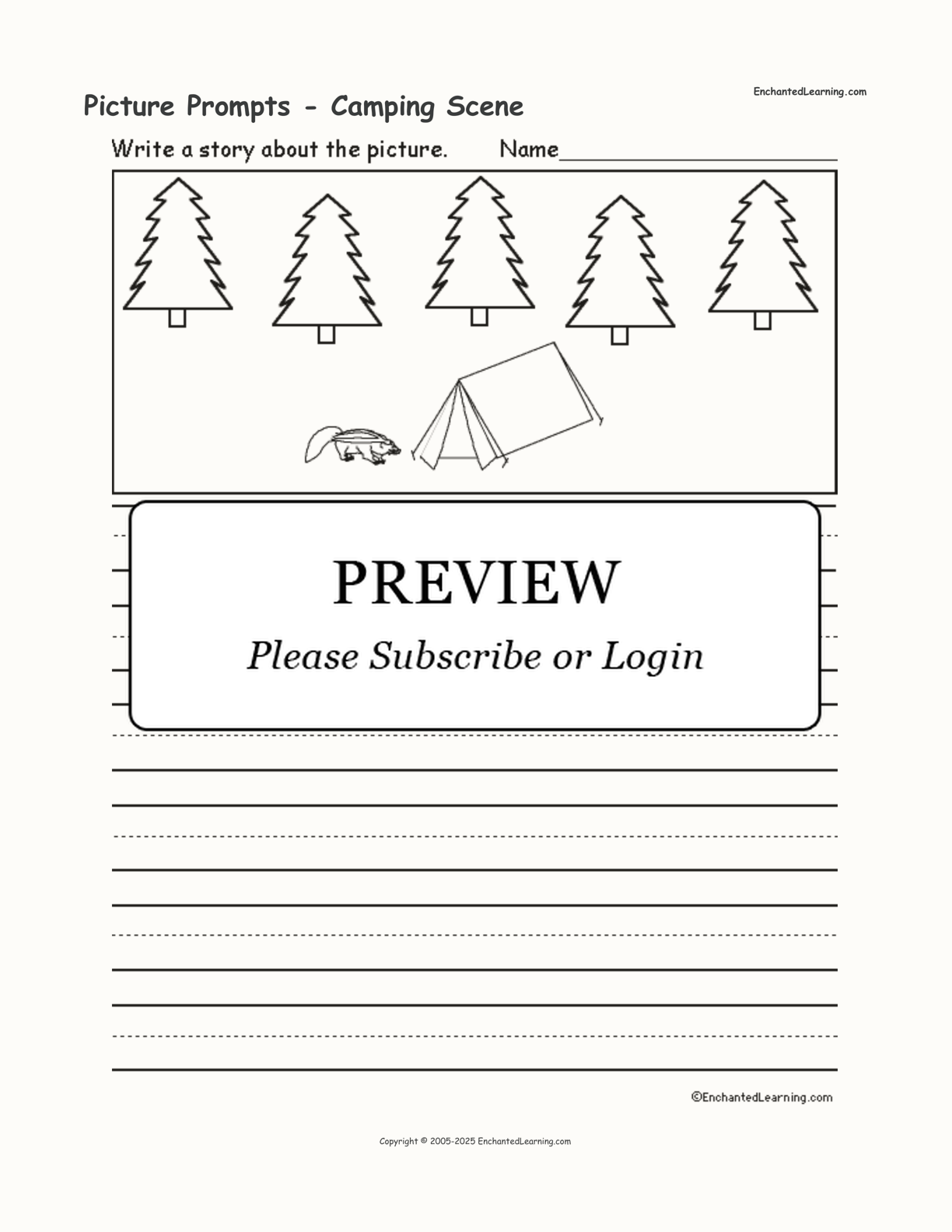 Write a story about the picture showing a skunk and a tent in a forest. This is a printout on writing for young students.