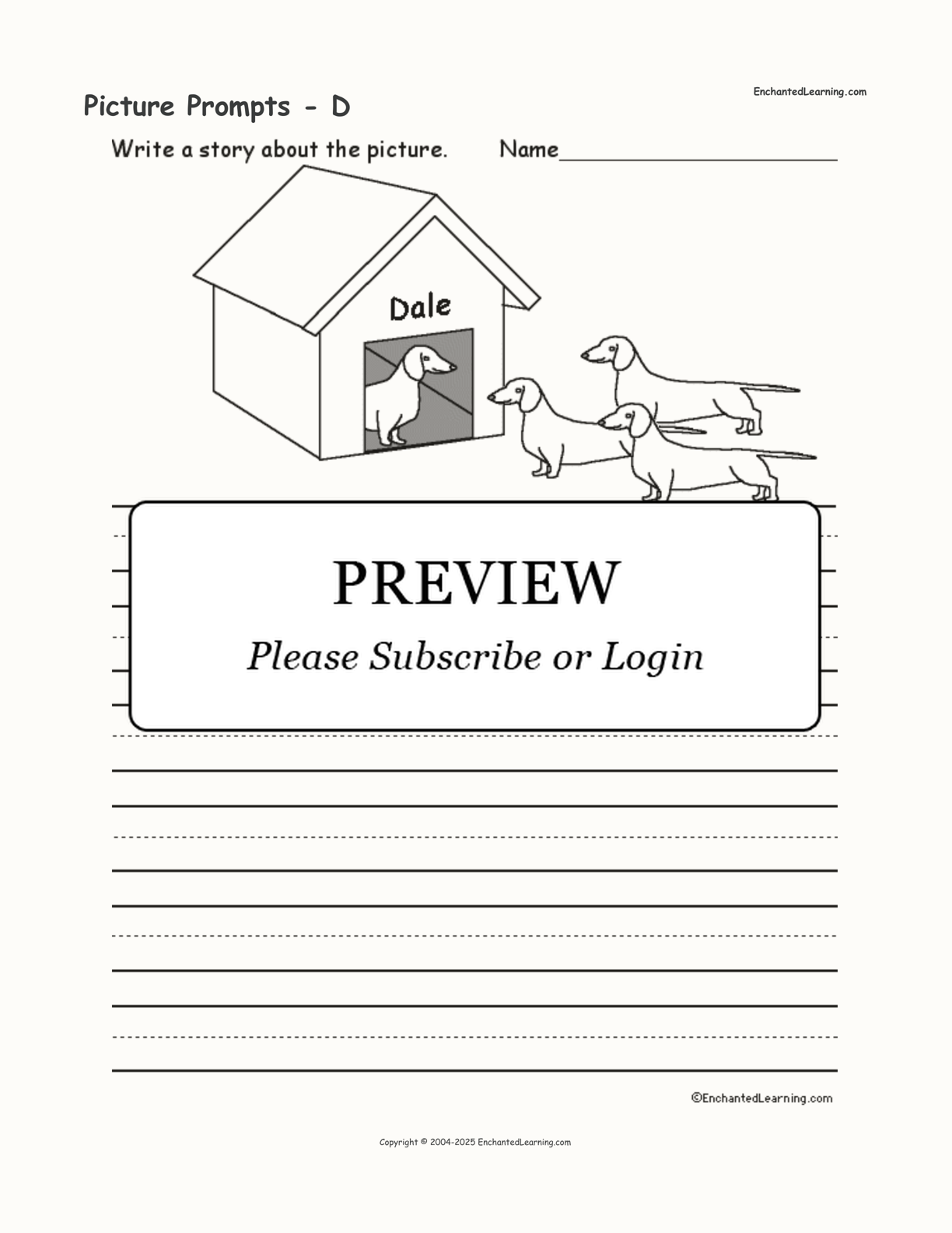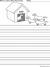 Write a story about the picture - D. The picture shows a dachshund in a doghouse (the doghouse has the name Dale on it). Three other dogs are outside the doghouse. This is a printout on writing for young students.