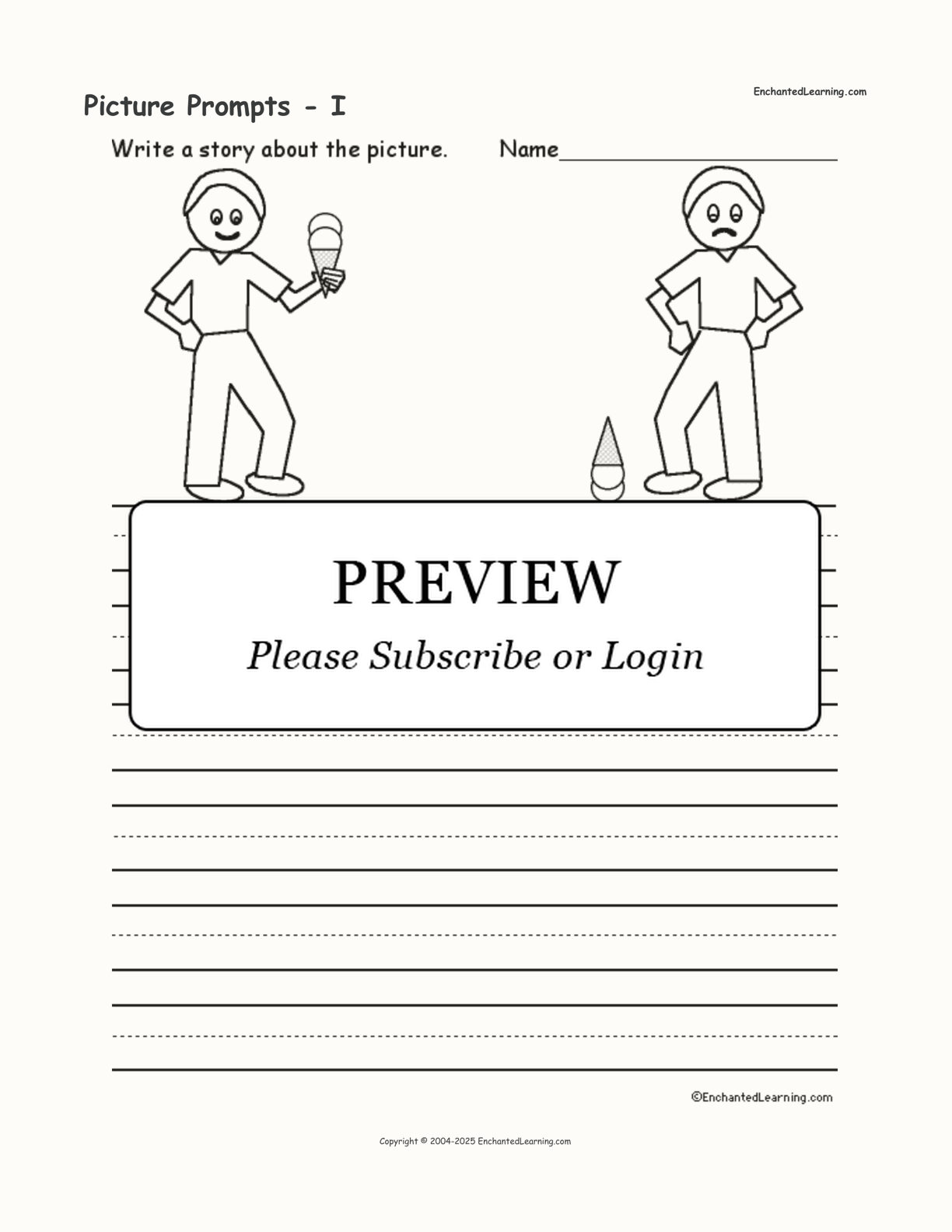 Write a story about the picture - I. The picture shows two boys with ice cream cones, but one boy has dropped his ice cream cone. This is a printout on writing for young students.