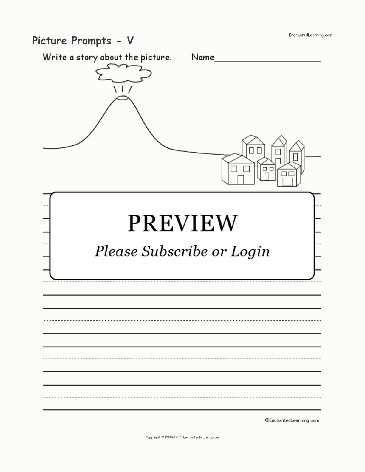 Write a story about the picture - V. The picture shows a volcano erupting near a village. This is a printout on writing for young students.