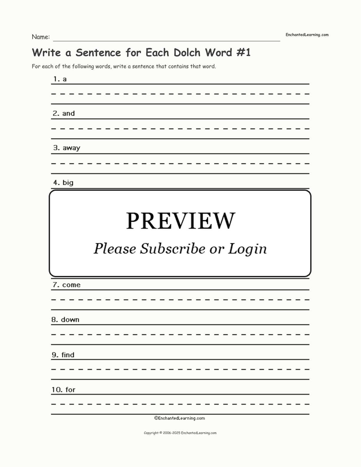Write a sentence for each of the Dolch spelling words for early readers. Words: a, and, away, big, blue, can, come, down, find, for.