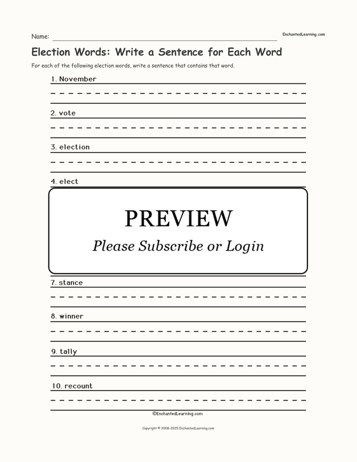 Write a sentence for each election word. This printable worksheet about writing is for early readers.