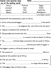 African Spelling Word Questions Use the list of words to answer simple questions about words related to Africa. Words: Africa, continent, equator, Sahara, Victoria, Cape, Nile, South, Egypt, Sudan, countries, Madagascar. Or go to the answers. |