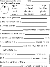 Apple Spelling Word Questions Use the list of apple words to answer simple questions. Words: apple, trees, fruit, seeds, blossom, orchard, delicious, deciduous, crisp, healthy, plants, sweet. Or go to the answers. |