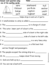Boat Spelling Word Questions Use the list of boat spelling words to answer simple questions. Words: oars, lifeboat, barge, port, starboard, captain, tugboat, hull, yacht, mast. Or go to the answers. |