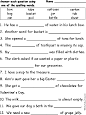 Container Spelling Word Questions Use the list of words to answer simple questions about words related to containers. Words: box, bag, can, tube, basket, pail, suitcase, jar, bottle, carton, tub, chest. Or go to the answers. |