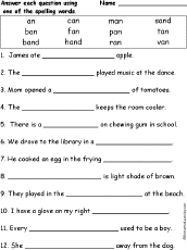 AN Spelling Word Questions Use the list of 'an' words to answer simple questions. Words: an, ban, band, can, fan, hand, man, pan, ran, sand, tan, van. Or go to the answers. |