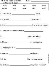 Dolch Spelling Word Questions #3 Use the list of Dolch spelling words to answer simple questions. Words: look, make, me, my, not, one, play, red, run, said. Or go to the answers. |