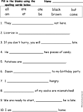 Dolch Spelling Word Questions #5 Use the list of Dolch spelling words to answer simple questions. Words: all, am, are, at, ate, be, black, brown, but, came. Or go to the answers. |