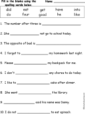 Dolch Spelling Word Questions #6 Use the list of Dolch spelling words to answer simple questions. Words: did, do, eat, four, get, good, have, he, into, like. Or go to the answers. |
