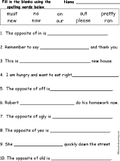 Dolch Spelling Word Questions #7 Use the list of Dolch spelling words to answer simple questions. Words: must, new, no, now, on, our, out, please, pretty, ran. Or go to the answers. |