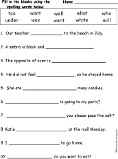 Dolch Spelling Word Questions #9 Use the list of Dolch spelling words to answer simple questions. Words: too, under, want, was, well, went, what, white, who, will. Or go to the answers. |