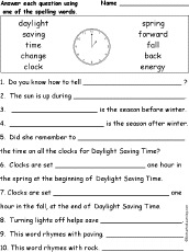 Daylight Saving Time Spelling Word Questions Use the list of spelling words to answer simple questions. Words: daylight, saving, time, change, clock, spring, forward, fall, back, energy. Or go to the answers. |