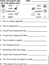 Fall Spelling Word Questions Use the list of spelling words to answer simple questions. Words: leaf, rake, scarecrow, crow, apple, web, pumpkin, hay, acorn. Or go to the answers. |