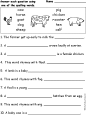 Farm Animals Spelling Word Questions Use the list of spelling words to answer simple questions. Words: cow, horse, goat, dog, sheep, pig, chicken, hen, calf. Or go to the answers. |