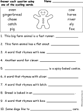 The Gingerbread Man Spelling Word Questions Use the list of spelling words from The Gingerbread Man to answer simple questions. Words: oven, gingerbread, chase, catch, pig, cow, horse, river, sly, fox. Or go to the answers. |