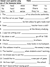 Homonyms: Spelling Word Questions #1 Use the list of homonyms to answer simple questions that test understanding. Words: buy, by, bye, heal, heel, he'll, seas, sees, seize, their, there, they're, to, too, two. Or go to the answers. |