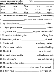Homonyms: Spelling Word Questions #2 Use the list of homonyms to answer simple questions that test understanding. Words: cent, scent, sent, dew, do, due, flew, flu, flue, rain, rein, reign, raise, rays, raze. Or go to the answers. |