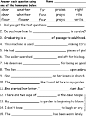 Homonyms: Spelling Word Questions #4 Use the list of homonyms to answer simple questions that test understanding. Words: dear, deer, flour, flower, weather, whether, for, fore, four, praise, prays, preys, right, rite, write. Or go to the answers. |