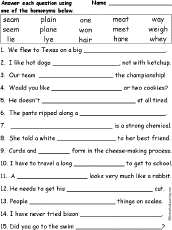 Homonyms: Spelling Word Questions #6 Use the list of homonyms to answer simple questions that test understanding. Words: seam, seem, lie, lye, plain, plane, one, won, hair, hare, meat, meet, way, weigh, whey. Or go to the answers. |