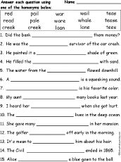 Homonyms: Spelling Word Questions #7 Use the list of homonyms to answer simple questions that test understanding. Words: red, read, creak, creek, pail, pale, war, wore, loan, lone, wail, whale, teas, tease, tees. Or go to the answers. |