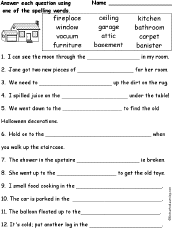 House Spelling Word Questions Use the list of house-related spelling words to answer simple questions. Words: fireplace, window, vacuum, furniture, ceiling, garage, attic, basement, kitchen, bathroom, carpet, banister. Or go to the answers. |