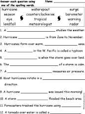 Hurricane Spelling Word Questions Use the list of hurricane-related spelling words to answer simple questions. Words: hurricane, season, eye, landfall, waterspout, counterclockwise, tropical, meteorologist, surge, barometer, warning, radar. Or go to the answers. |