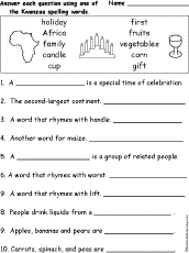 Kwanzaa Spelling Word Questions Use the list of Kwanzaa spelling words to answer simple questions. Words: holiday, Africa, family, candle, cup, first, fruits, vegetables, corn, gift. Or go to the answers. |