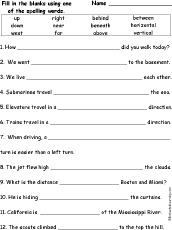 Location Spelling Word Questions Use the list of location-related spelling words to answer simple questions. Words: up, down, west, right, near, far, behind, above, between, horizontal, vertical. Or go to the answers. |