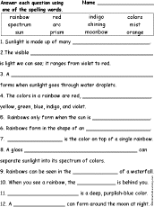 Rainbow Spelling Word Questions Use the list of rainbow spelling words to answer simple questions. Words: rainbow, spectrum, sun, red, arc, prism, indigo, shining, moonbow, colors, mist, orange. Or go to the answers. |
