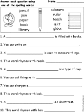 School-Related Spelling Word Questions Use the list of school-related spelling words to answer simple questions. Words: pencil, pen, paper, book, library, scissors, ruler, teach, quiz, globe. Or go to the answers. |