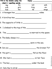 Short I Spelling Word Questions Use the list of 'short i' spelling words to answer simple questions. Words: big, crib, fish, fix, grin, hid, hill, king, lid, milk, six, wings. Or go to the answers. |