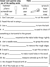 Tool Spelling Word Questions Use the list of tool spelling words to answer simple questions. Words: hammer, pliers, screwdriver, file, toolbox, drill, saw, ax, wrench, tape, level, vise. Or go to the answers. |