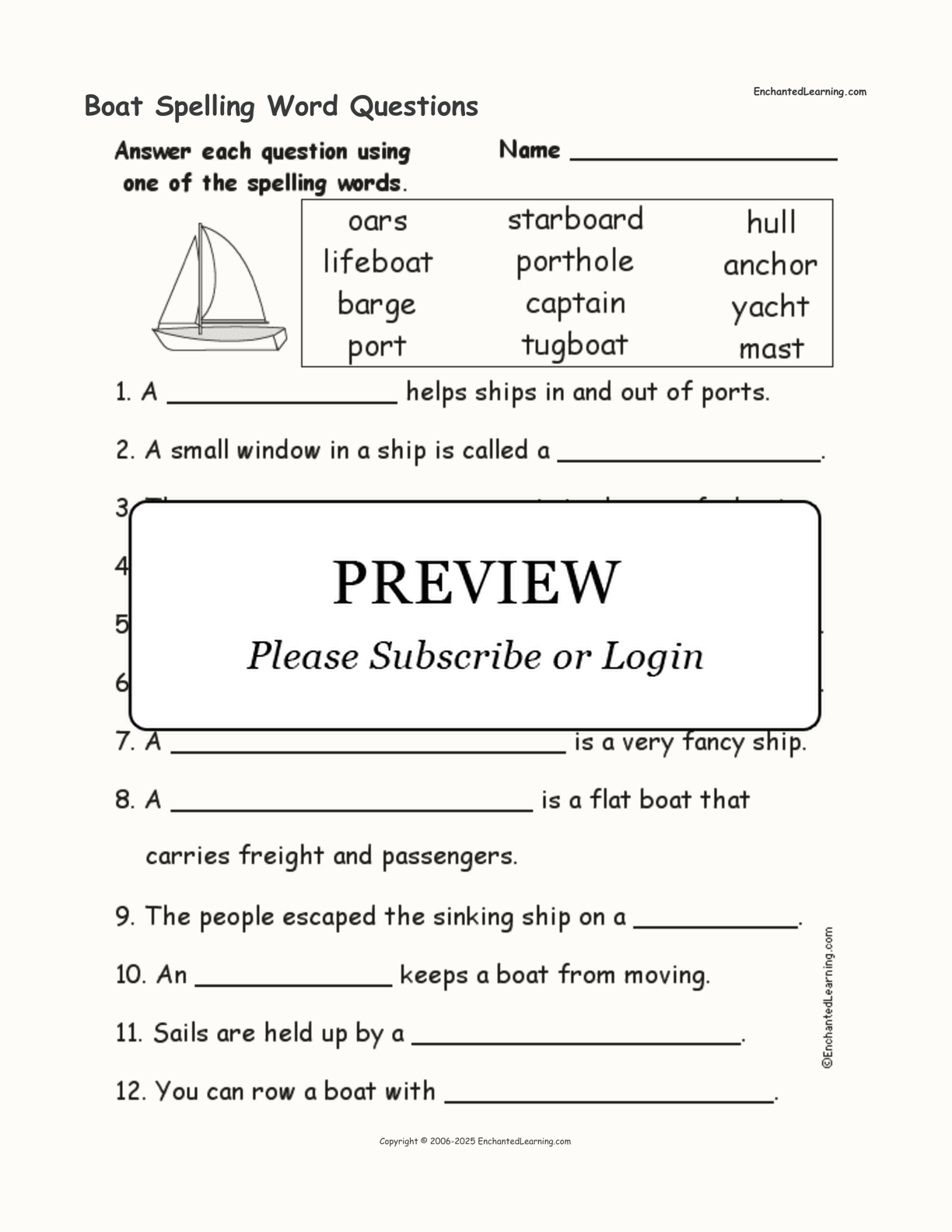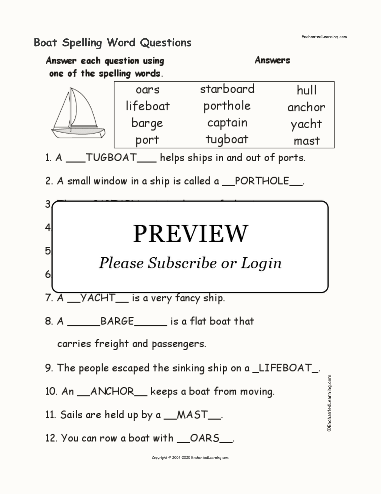 Words: oars, lifeboat, barge, port, starboard, captain, tugboat, hull, yacht, and mast.