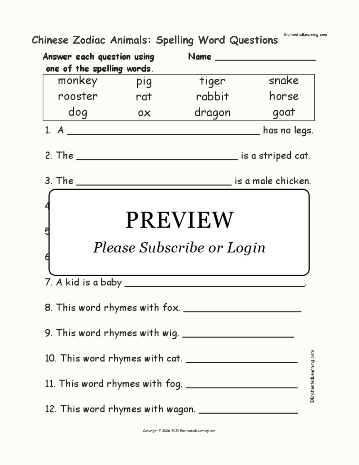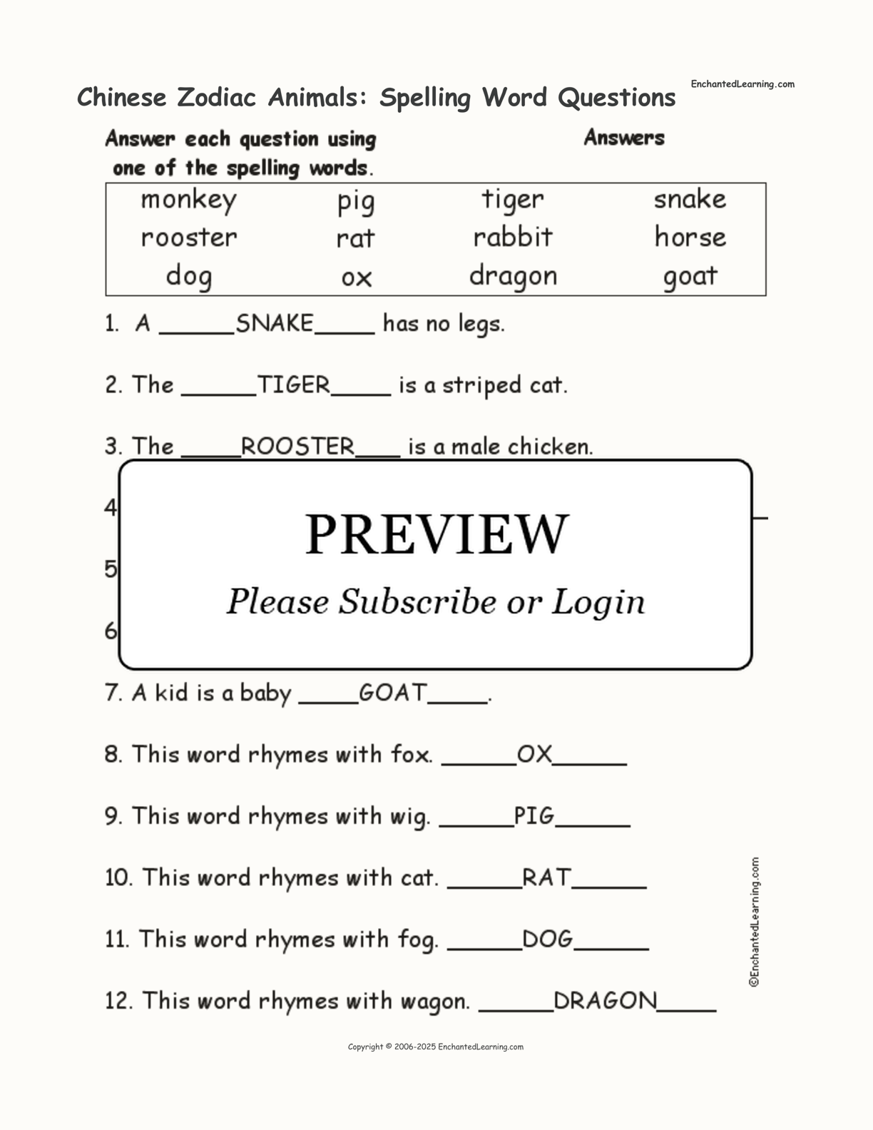 Use the list of Chinese Zodiac animal spelling words to answer simple questions.