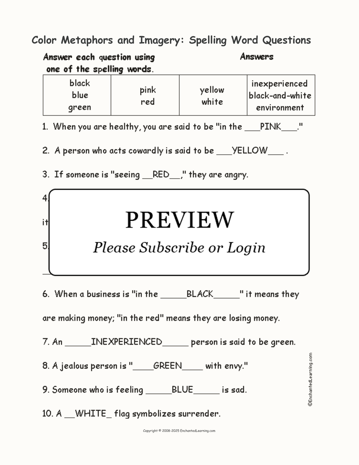 Use the list of ‘Color Metaphors and Imagery’ words to answer simple questions.