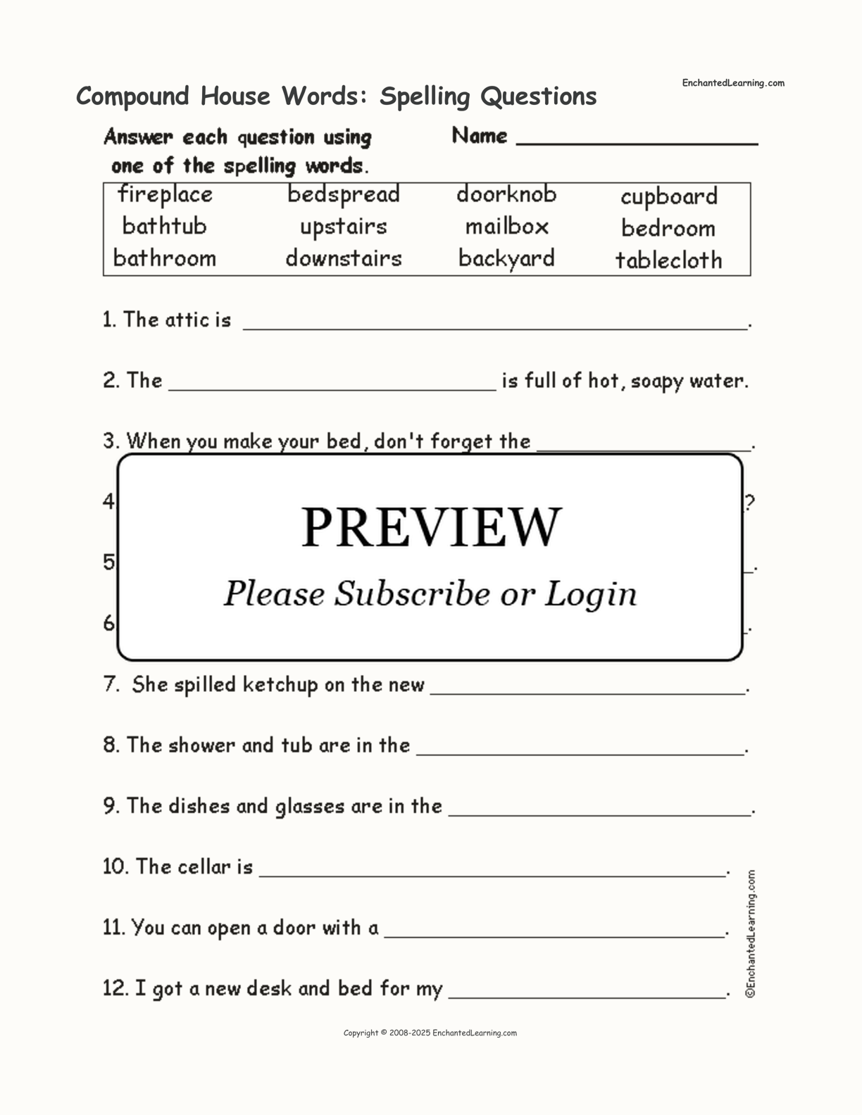 Words: fireplace, bathtub, bathroom, bedspread, upstairs, downstairs, doorknob, mailbox, backyard, cupboard, bedroom, and tablecloth.
