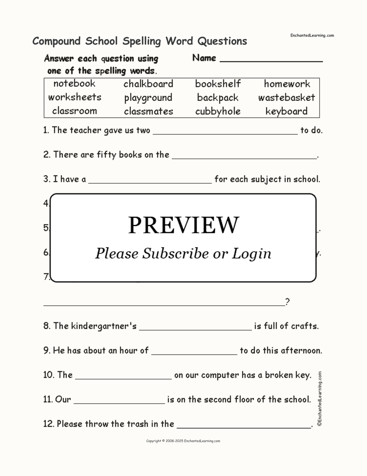 Words: worksheets, classroom, chalkboard, playground, classmates, bookshelf, backpack, cubbyhole, homework, wastebasket, and keyboard.